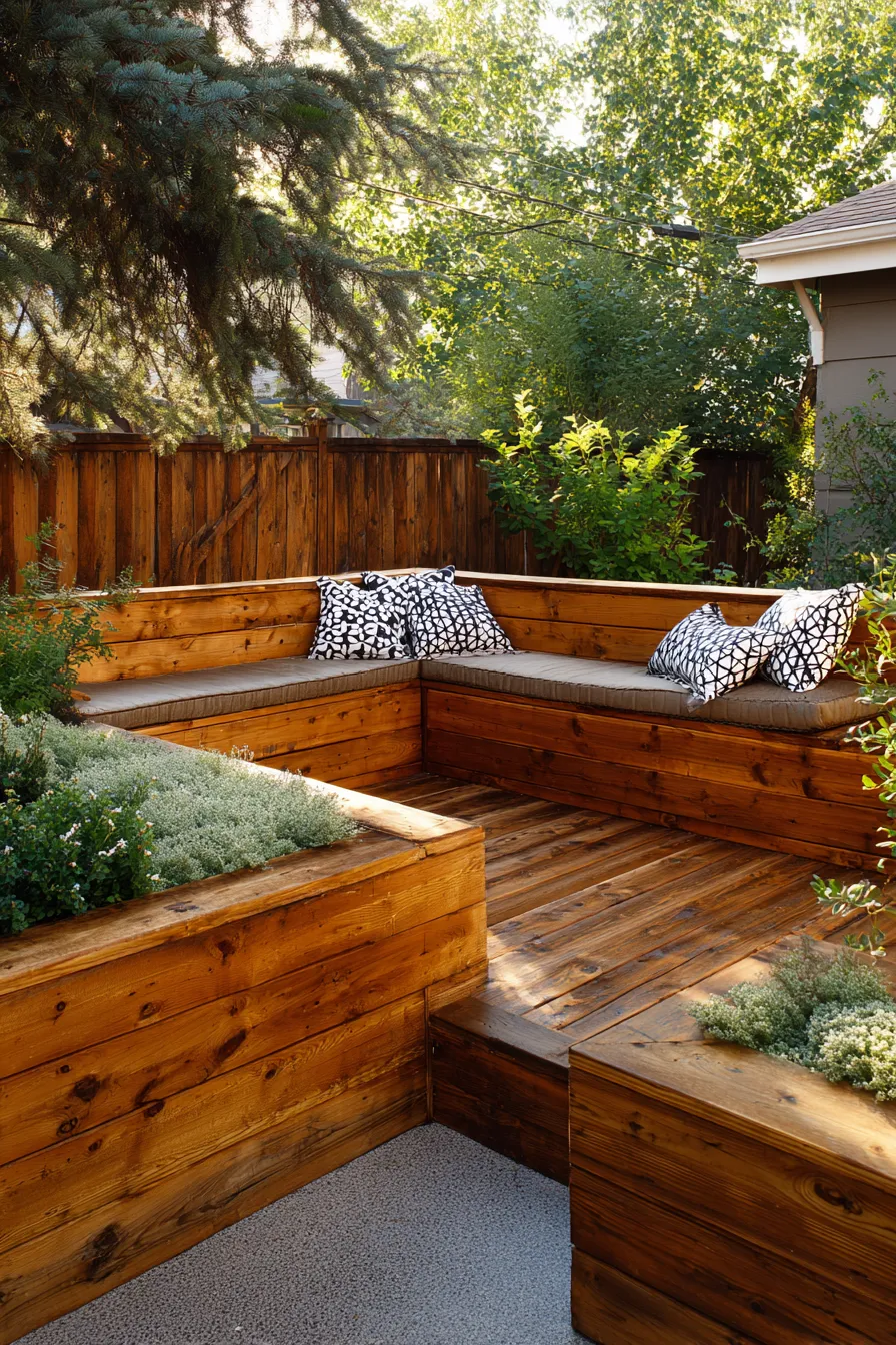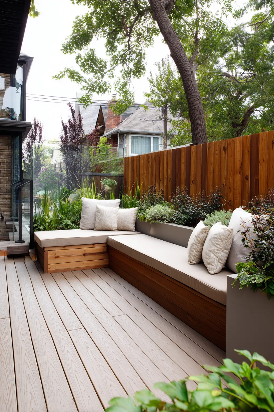 This design showcases a clean lined built in bench running along the fence line with integrated planters behind it. Soft cushions and textured pillows balance the warm wood base while the greenery adds privacy and softness. The layout feels open without wasting a single inch of space.
