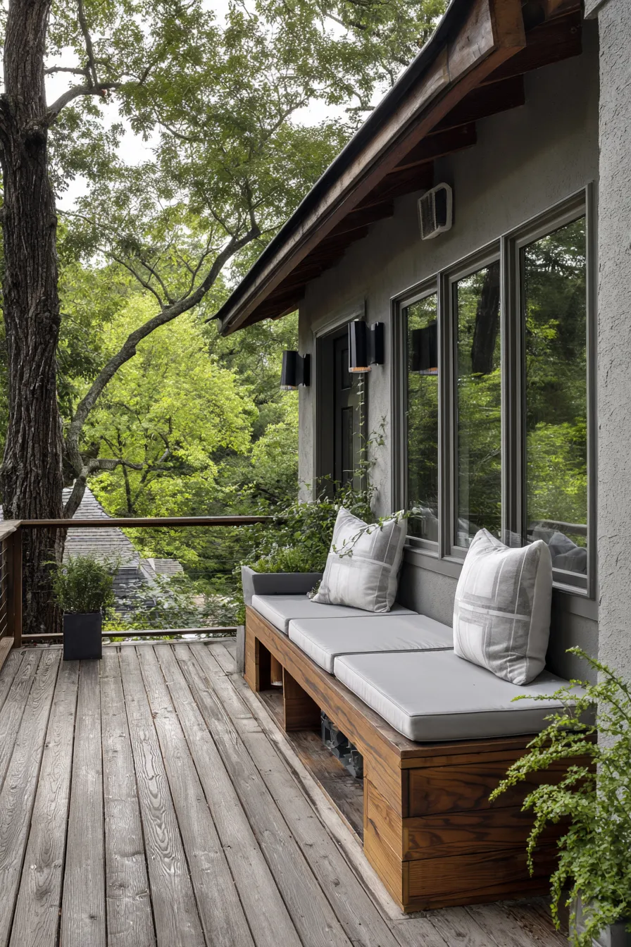 This built in bench sits flush against the house creating a simple and practical seating solution. The muted cushions and natural wood tones keep everything understated while the surrounding trees give the deck a peaceful tucked away feel.