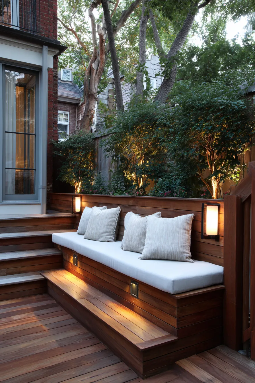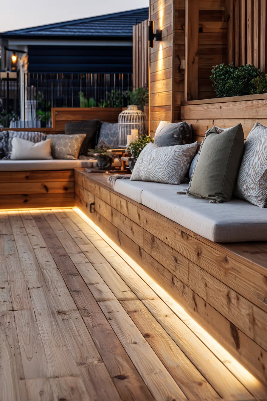 This deck features a long built in bench with integrated lighting underneath that softly illuminates the wood floor. The seating is finished with layered pillows in calming neutrals and subtle patterns that add warmth without clutter.