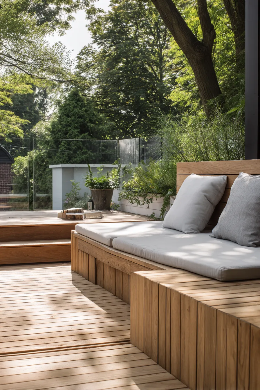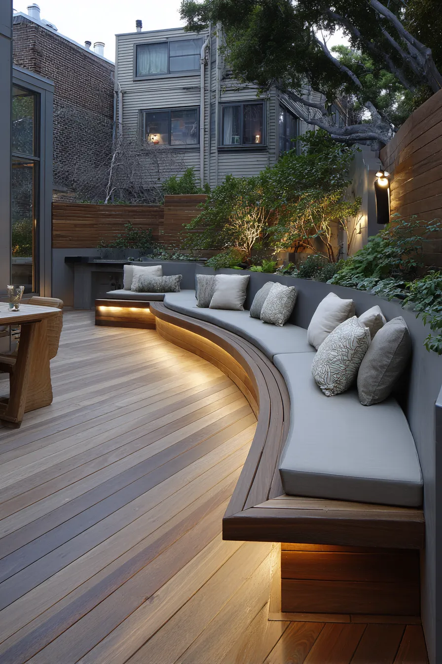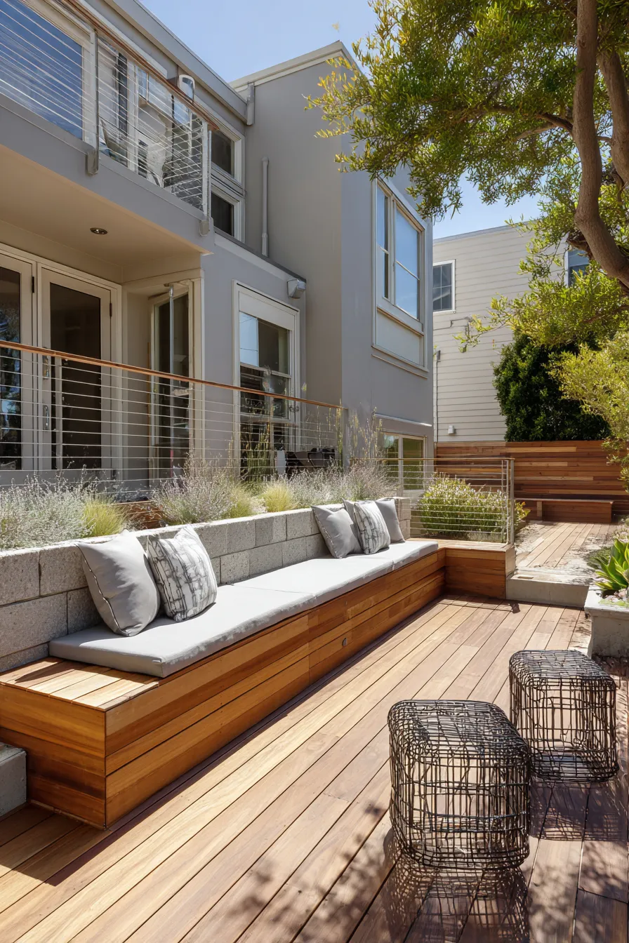 This deck features a sleek built in bench framed by low walls and simple landscaping. Light cushions contrast beautifully with the warm wood base while the clean lines give the space a modern structured feel.