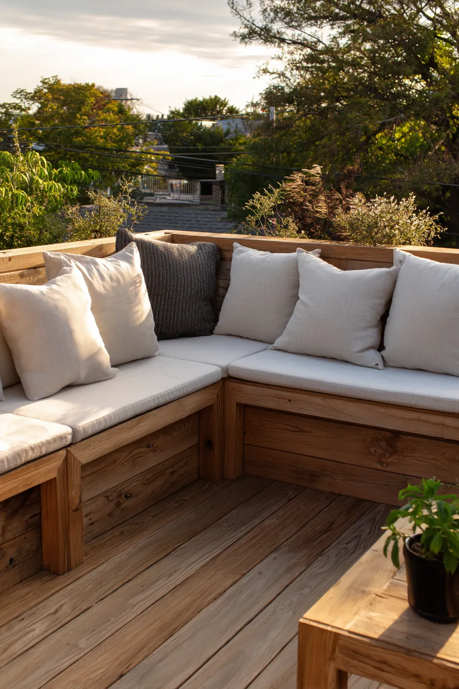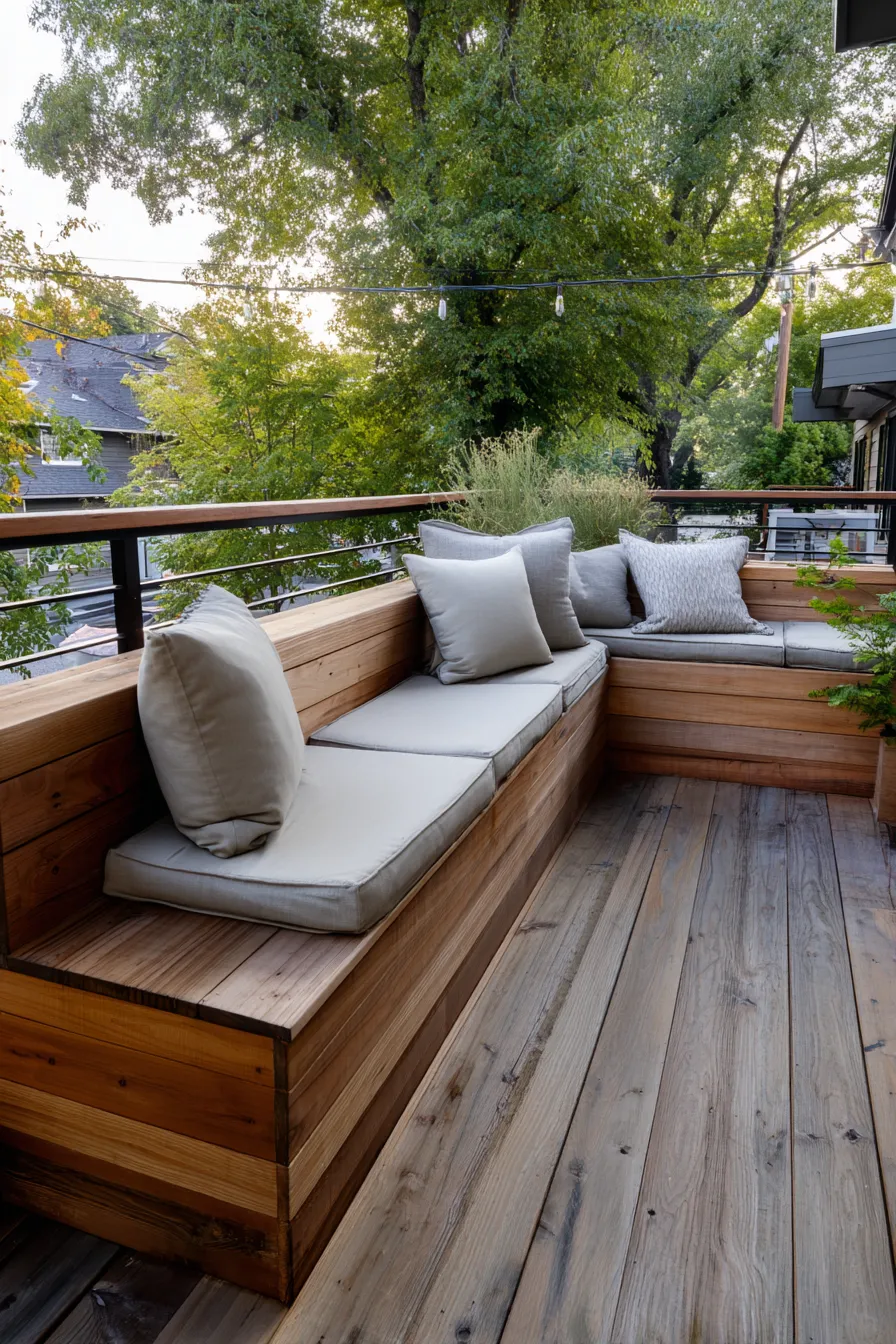 This deck features a beautifully built in corner bench crafted from warm natural wood that wraps neatly along the railing. Thick seat cushions in soft neutral tones keep things comfortable while matching throw pillows add a layered cozy look. The clean lines of the seating make great use of the corner space without crowding the deck and the surrounding trees create a calm leafy backdrop.