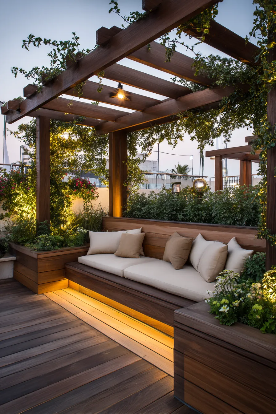 This deck showcases a built in bench framed by a wood pergola and overflowing greenery. Soft cushions and warm lighting make the seating feel like an outdoor living room while the structure defines the space beautifully.