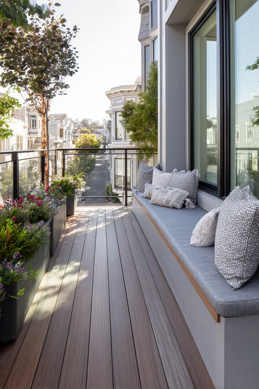 This narrow deck uses a sleek built in bench tucked neatly along the exterior wall. Light cushions and textured pillows keep the look cozy while tall planters add color and softness without taking up valuable floor space. The open railing keeps the view clear and airy.