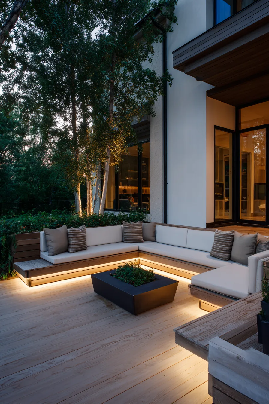 This design showcases an L shaped built in bench surrounding a low planter centerpiece. Neutral cushions and subtle accent pillows create a calm palette while soft lighting under the seating highlights the clean lines of the deck. The surrounding trees and modern architecture add to the relaxed yet refined vibe.
