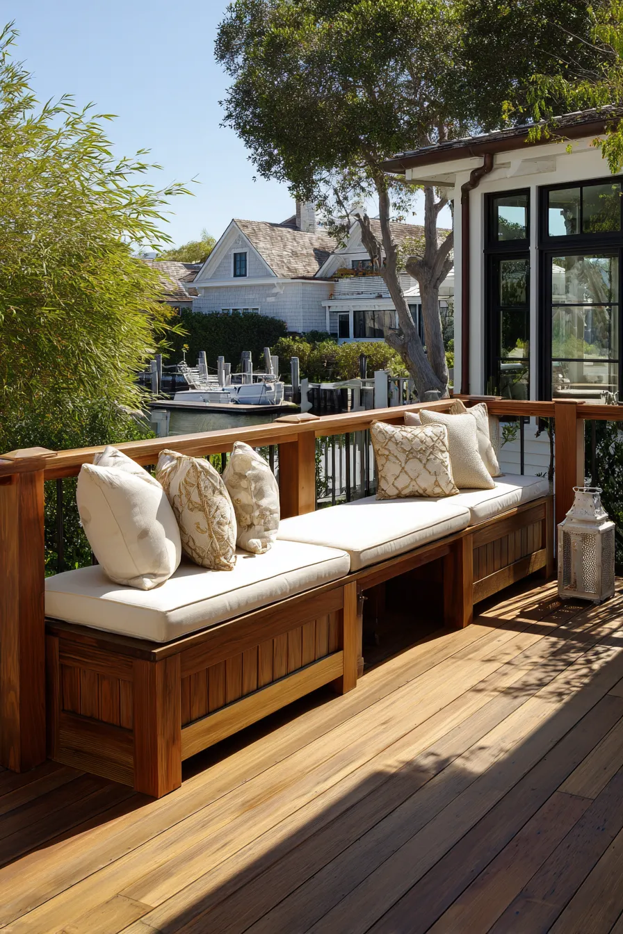 This deck features a long built in bench running along the railing with rich wood tones and plush cream cushions. Decorative pillows add a soft touch while lanterns and greenery enhance the relaxed outdoor feel. The bench design keeps the center of the deck open and functional.