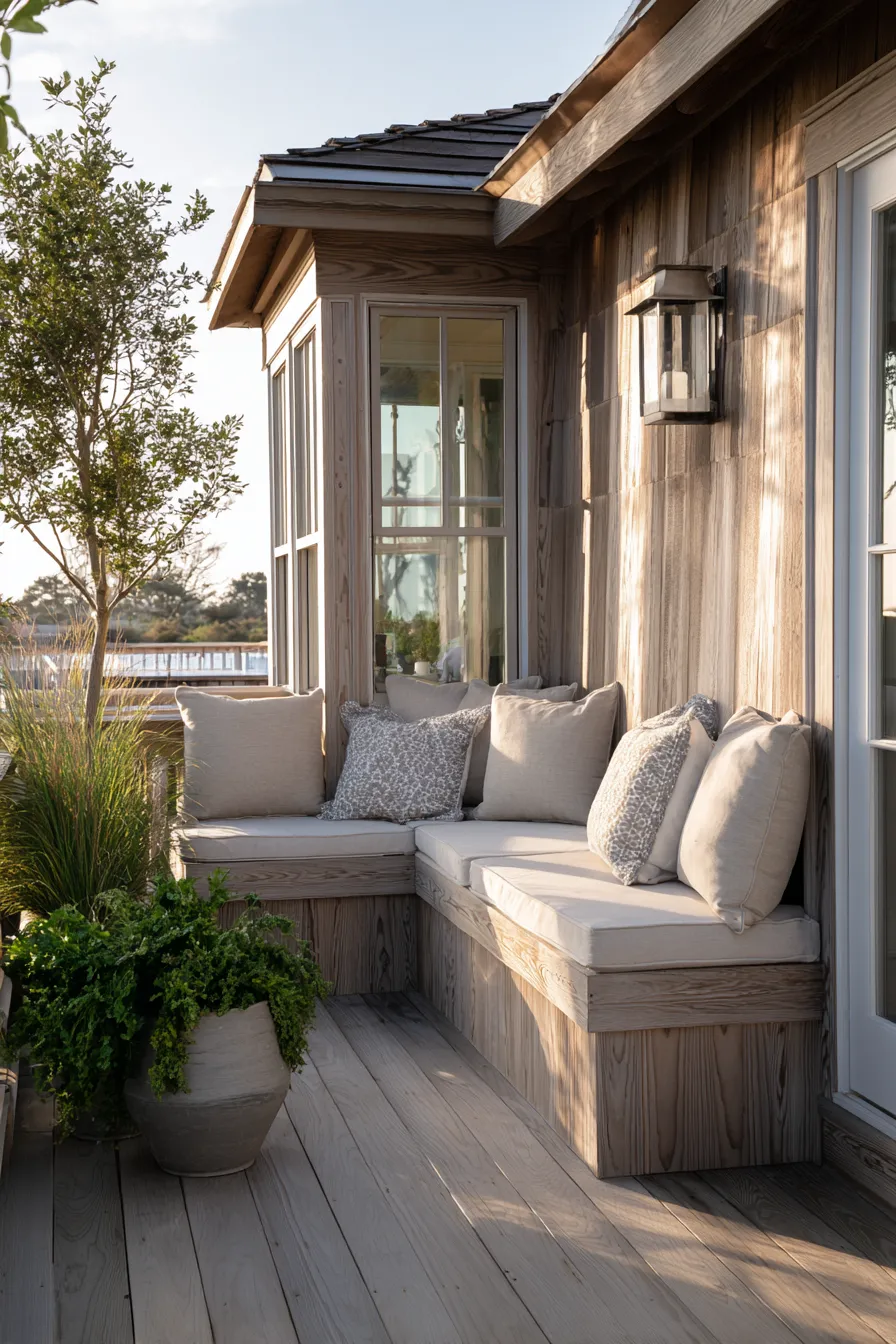 This built in corner bench wraps neatly around the exterior wall of the home using light wood and soft neutral cushions. Textured pillows add warmth while potted plants bring in a fresh natural element. The overall look feels bright and calm.