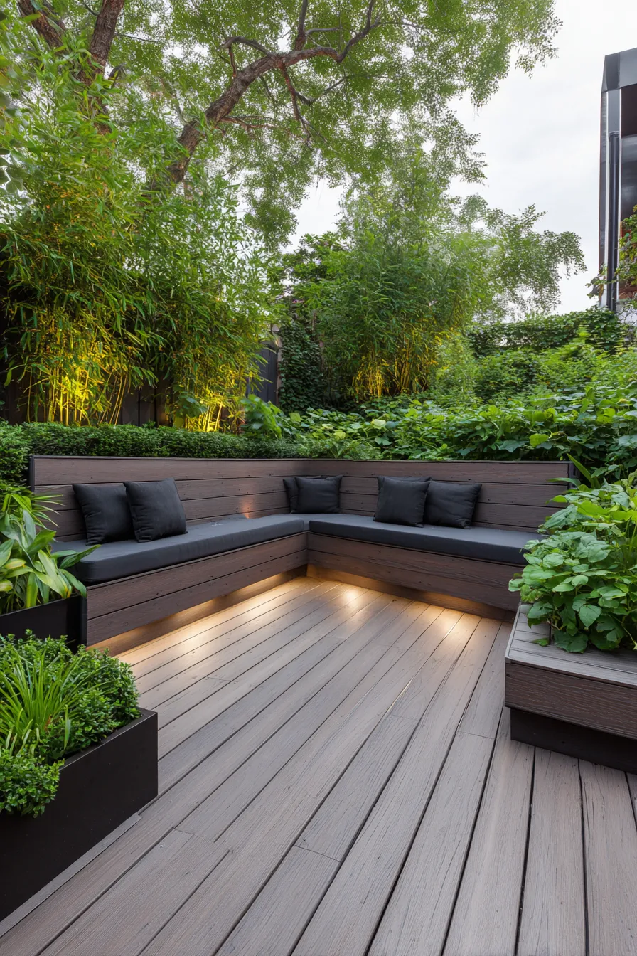 This deck uses a sleek built in bench that runs along two sides creating an inviting lounge area. The darker wood tones contrast beautifully with the light decking and charcoal cushions. Surrounding plants and subtle lighting make the seating feel tucked into a private garden retreat.