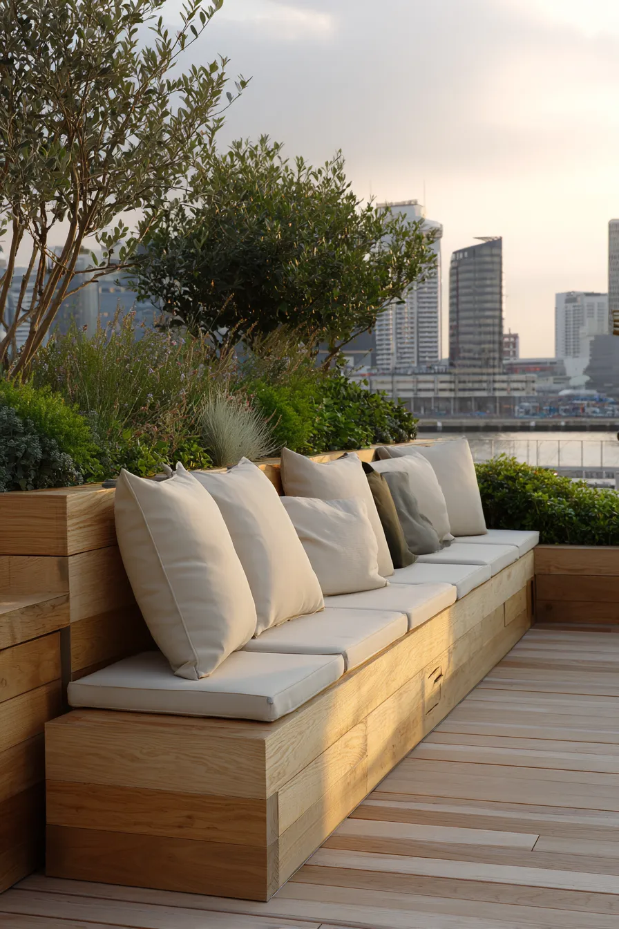 This built in bench stretches across the deck edge offering uninterrupted seating and a stunning city view. The light wood base pairs effortlessly with plush off white cushions and a mix of neutral pillows. Planters integrated behind the seating soften the urban feel and add a touch of nature.