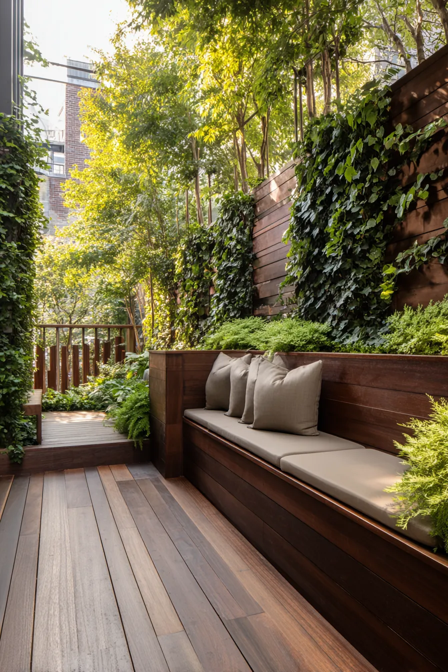 This deck makes excellent use of a narrow layout with a long built in bench running along one side. Dark wood seating blends seamlessly with the vertical greenery and privacy walls. Neutral cushions keep the look soft while the plants add texture and life.