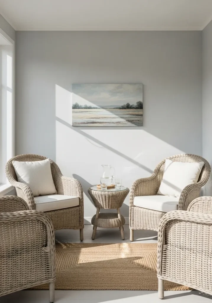 This sun-drenched seating area is a masterclass in lighthearted coastal elegance. The walls are dressed in a very pale, clean gray that acts as a crisp canvas for the beautiful woven wicker armchairs and their plush white cushions. A matching wicker side table holds a simple glass pitcher and water glasses, while a textured jute rug adds an earthy, organic feel underfoot. The landscape painting on the back wall brings in a touch of nature and ties together the soft, sunlit tones of the entire space.