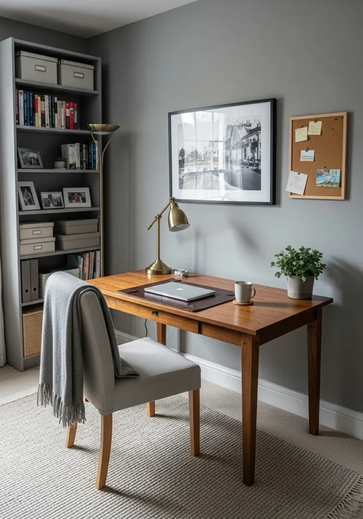 This workspace feels like the ultimate hub for getting things done while staying surrounded by style. The walls are finished in a medium-bodied gray that offers a steady, grounded backdrop for the rich wood desk and matching chair legs. A tall, built-in bookshelf in a slightly darker slate provides plenty of room for organization, while the brass desk lamp and framed black-and-white photography add a touch of executive flair. The neutral rug and gray throw blanket draped over the upholstered chair soften the room, making it feel just as comfortable as it is professional.