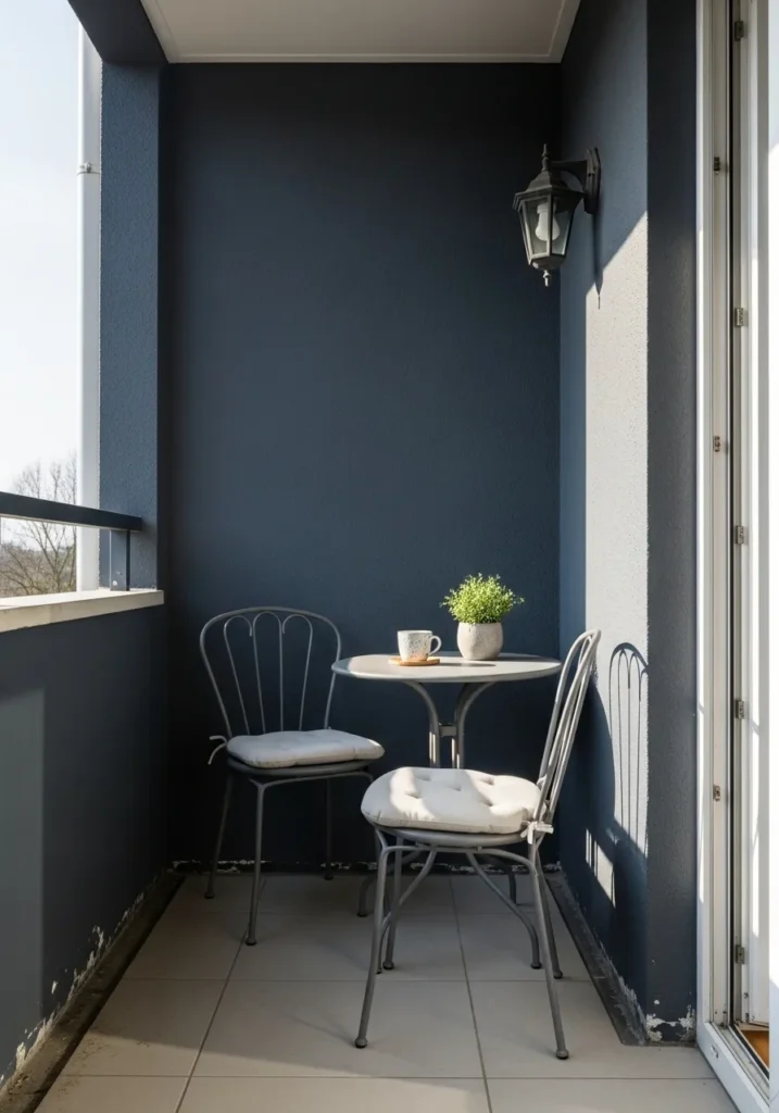This compact balcony space is a masterclass in using dark tones to create a high-end architectural feel. The deep, charcoal gray walls provide a stunning, velvety backdrop that makes the white seat cushions and green potted plant practically glow in the sunlight. A slender bistro set with a round table and classic metal chairs fits the narrow space perfectly, turning a simple outdoor corner into a functional morning coffee nook. The sharp contrast between the dark paint and the bright balcony railing adds a sophisticated, urban edge that feels incredibly intentional and modern.