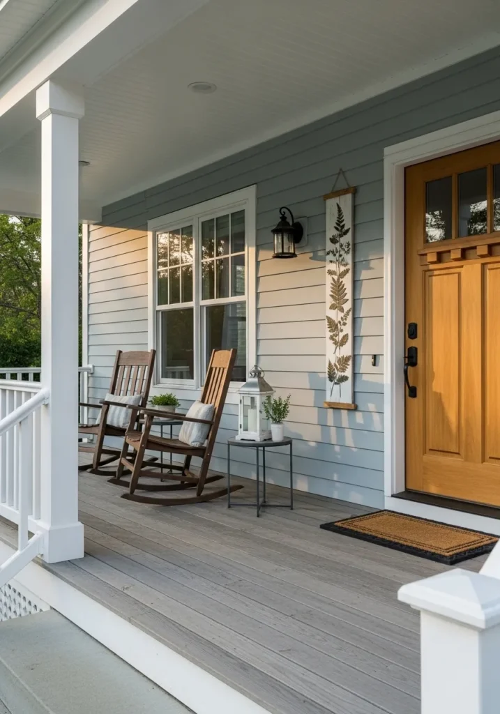 This charming porch design captures the essence of coastal living with its light blue-gray siding and crisp white trim. The soft wall color provides a refreshing contrast against the rich honey-colored wood of the front door and the matching dark wood rocking chairs. A cozy white lantern and a vertical botanical art piece add a touch of personality, while the light gray decking keeps the entire look feeling cohesive and bright. Every element from the simple black wall sconce to the small potted greens works together to create an entryway that feels incredibly airy and full of life.
