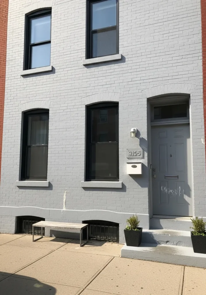 This row home exterior is a total lesson in how to modernize a classic brick facade with just a bit of paint. The soft and slightly warm gray transforms the traditional brick texture into something that feels incredibly current and high-end. Black window frames provide a sharp and graphic contrast while the matching gray door keeps the entryway looking streamlined and tidy. A simple concrete stoop and a pair of dark planters with fresh greenery finish off the look, creating an entrance that is both minimalist and full of character.