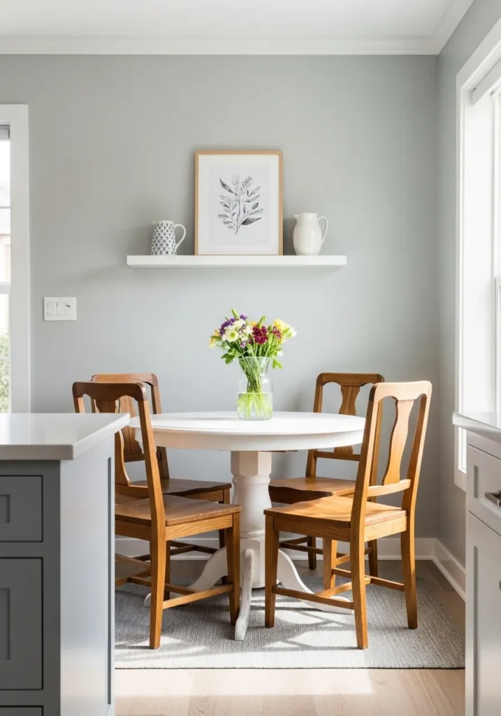 This sunny little corner is a masterclass in clean, effortless styling. The walls are coated in a cool, light gray that feels incredibly fresh alongside the white pedestal table and matching floating shelf. Four vintage-inspired wooden chairs bring a lovely dose of warmth and history to the setup, while the colorful bouquet provides a cheerful focal point. Between the natural light pouring in and the simple botanical art, the whole space feels balanced and beautifully uncluttered.