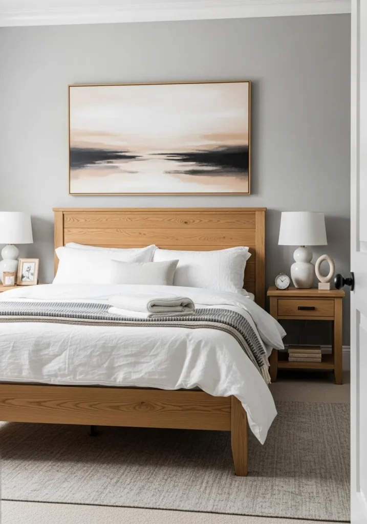 This guestroom is a masterclass in combining classic neutral tones with a touch of modern warmth. The walls are bathed in a beautiful, mid-tone gray that feels incredibly balanced, serving as a sophisticated backdrop for the stunning honey-oak bed frame and matching nightstands. Crisp white linens and a plush gray throw create a cloud-like sleeping area, while the oversized landscape art above the headboard pulls in those gorgeous earthy tones from the wood furniture. A soft, textured area rug and elegant white lamps finish the space, making the entire room feel like a high-end hotel suite.