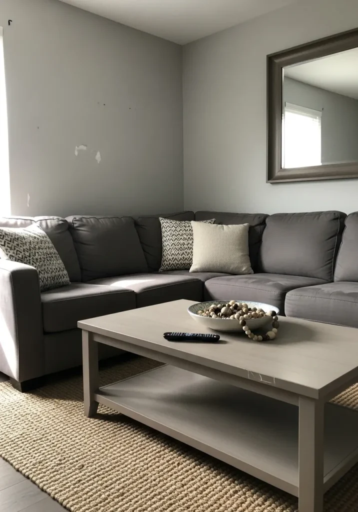 This living room layout focuses on a large charcoal sectional that invites you to sink in and stay for a while. The walls are finished in a soft greige that leans slightly warm, creating a beautiful contrast against the dark fabric of the sofa and the light gray coffee table. A large rectangular mirror with a simple frame reflects the light from a nearby window, helping the space feel more open and connected. The natural texture of the jute rug and the decorative wooden beads in the bowl add a touch of organic charm that keeps the modern lines from feeling too sharp or impersonal.