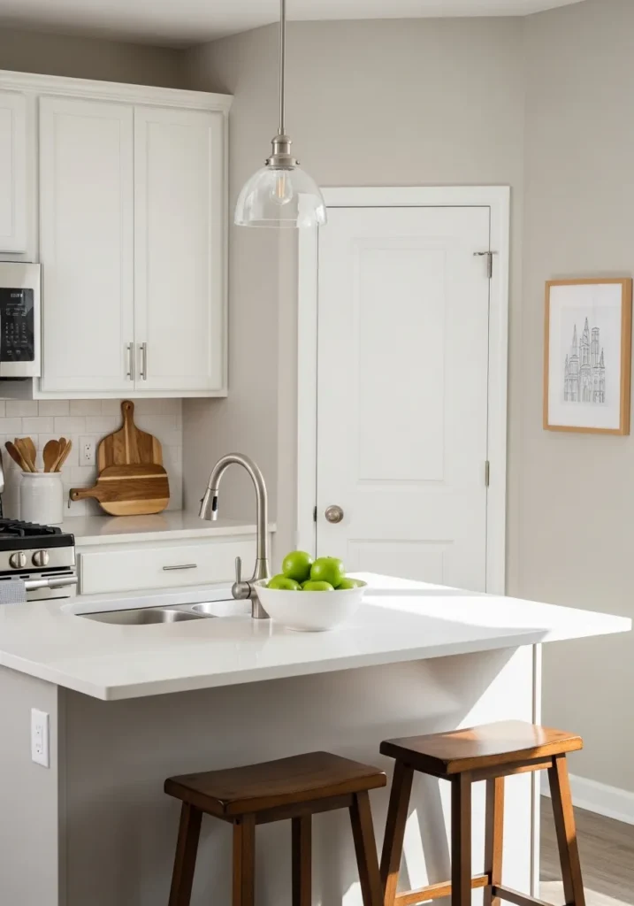 This kitchen setup feels like the ultimate heart of the home with its clean lines and soft palette. The walls are bathed in a beautiful greige that strikes the perfect balance between cozy and modern. White Shaker cabinets and subway tiles keep things looking fresh, while the dark wood barstools provide a grounded contrast against the bright island. I love how the glass pendant light adds a touch of sparkle without blocking the open view of the room.