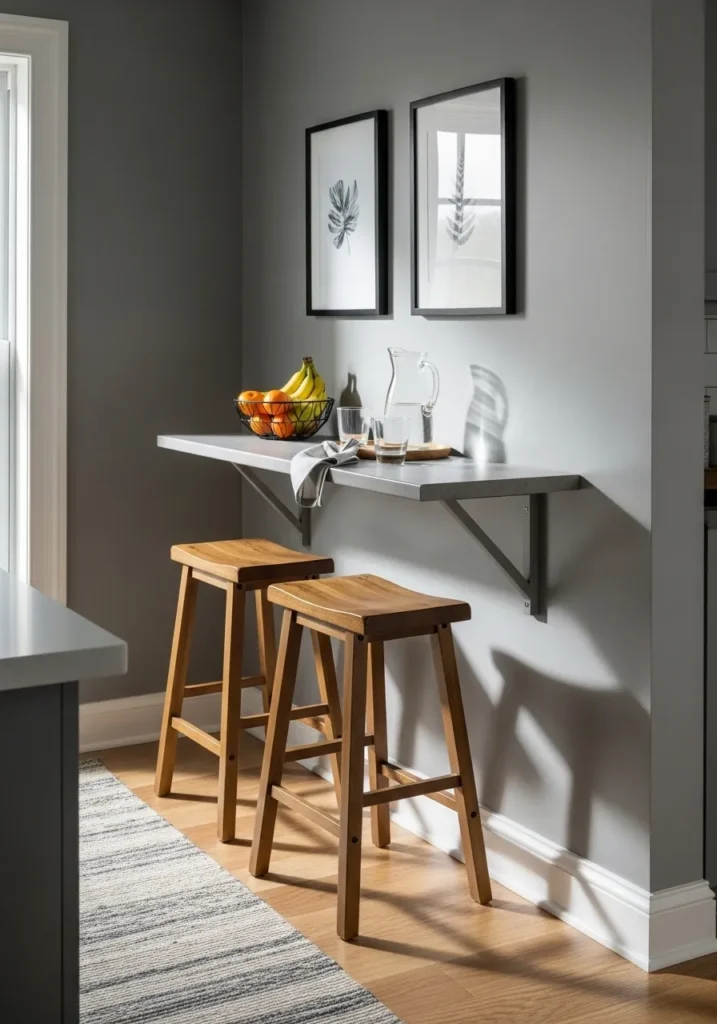 This clever kitchen nook makes the most of a small footprint with a floating gray counter and a pair of gorgeous natural wood barstools. The wall is painted in a cool and crisp gray that has just a hint of blue to keep things looking modern and fresh. Two black and white botanical prints are hung vertically to draw the eye upward, while the warm sunlight creates beautiful shadows across the smooth plaster. It is a fantastic example of how to create a dedicated spot for a quick bite or a morning coffee without cluttering up the main walkways of your home.