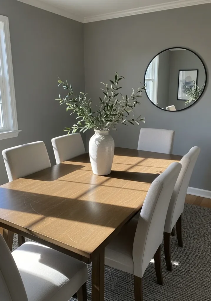 This dining area showcases a stunning mid-tone gray that brings a sense of depth and maturity to the space. The cool wall color acts as a sharp backdrop for the warm wood of the dining table and the creamy white upholstery of the chairs. A large circular mirror breaks up the straight lines of the room, while a textured gray rug adds an extra layer of comfort underfoot. The white crown molding and window trim provide a crisp border that makes the gray walls feel even more intentional and high-end.