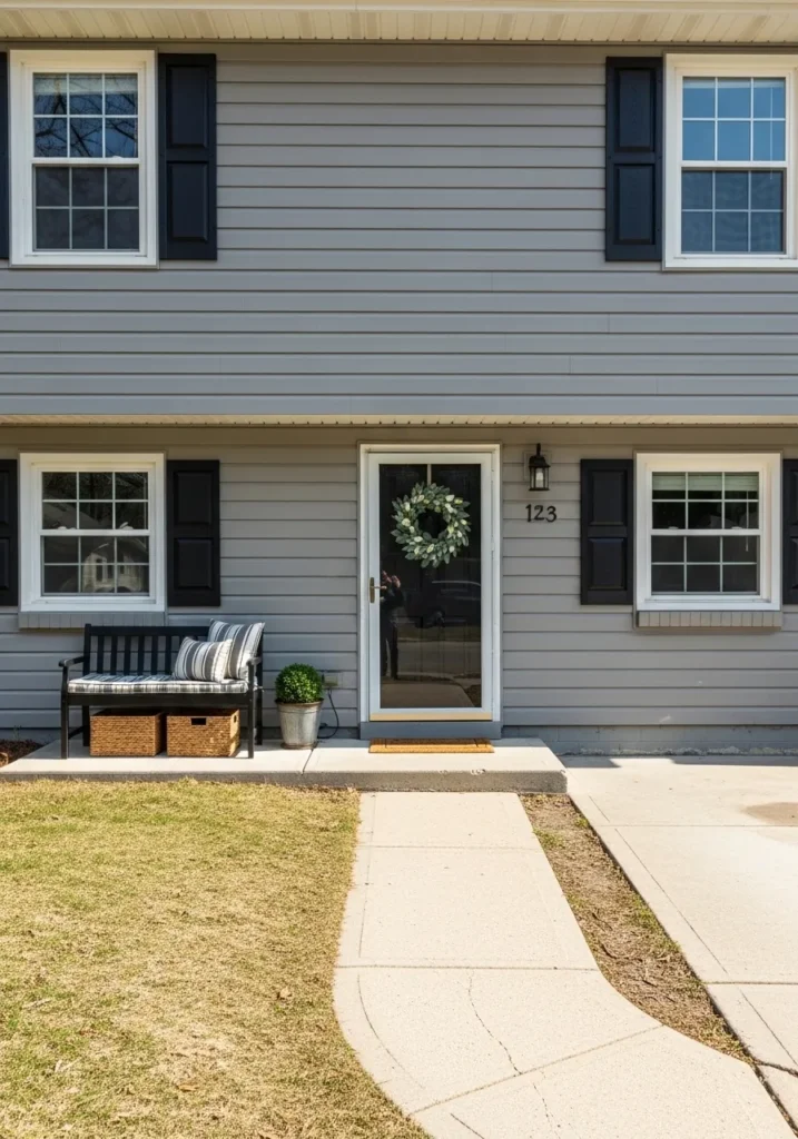 This home exterior is a masterclass in curb appeal with its clean horizontal siding and striking color palette. The deep gray walls create a beautiful foundation that makes the crisp white window frames and door trim absolutely beam. Jet black shutters provide a classic touch of symmetry, while the cozy front porch area is styled with a charming black bench and woven storage baskets. A simple eucalyptus wreath on the door and a pop of green from a potted shrub give the whole entryway a lively and finished look that feels both modern and traditional.