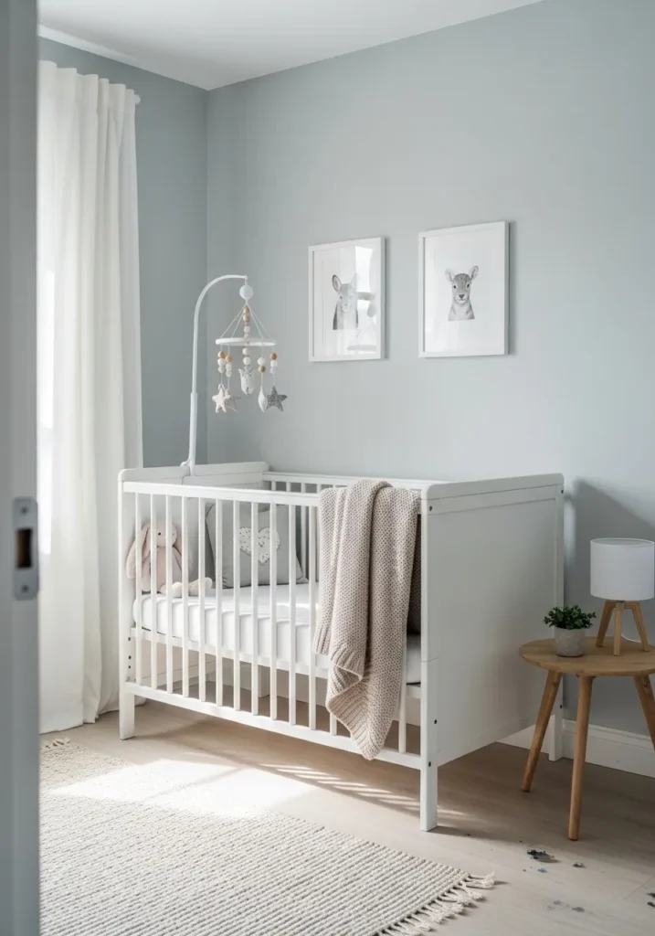 This nursery is the definition of a peaceful retreat with its soft blue-toned gray walls and crisp white furnishings. A classic white slat crib takes center stage, dressed in neutral bedding and a chunky knit throw that adds a wonderful tactile element to the room. Above the crib, two adorable animal sketches in white frames bring a playful yet sophisticated touch, while the sleek white mobile and linen curtains keep the overall aesthetic light and airy. The light wood side table and textured jute rug ground the space with natural warmth, ensuring the cool wall color feels cozy and inviting rather than chilly.
