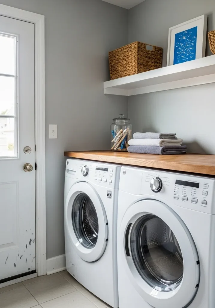 This laundry area proves that even the most utilitarian spaces can look like they belong in a magazine. The medium-toned gray on the walls provides a sophisticated backdrop for the sleek white front-loading washer and dryer. A warm wood countertop stretches across the appliances, offering a practical folding station while bringing in a touch of natural texture. White floating shelves and a classic paneled door keep the room feeling bright and airy, while woven baskets and neatly folded towels add a sense of organized charm.