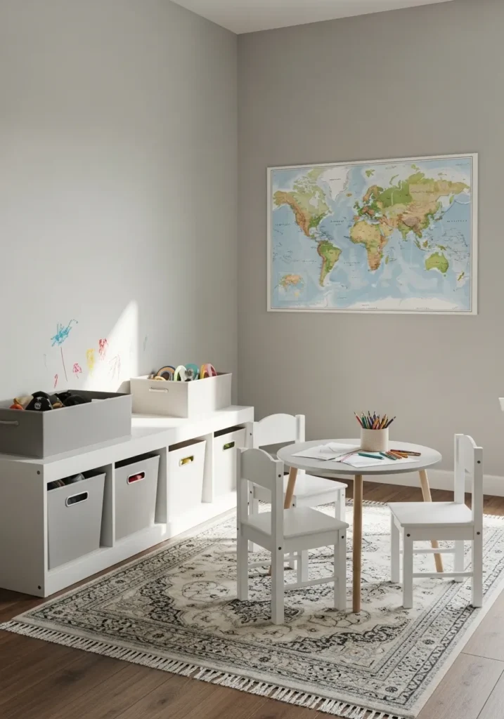 This bright and airy playroom design is a perfect example of how a warm gray can ground a high-energy space. The walls are painted in a soft, taupe-leaning gray that provides a sophisticated neutral backdrop for all the colorful activities happening within. A long white storage unit keeps toys neatly tucked away in gray fabric bins, while a petite white table and chair set sits ready for the next art project. The room is tied together by a vintage-inspired patterned rug and a large world map on the wall, creating a space that feels both educational and incredibly stylish.