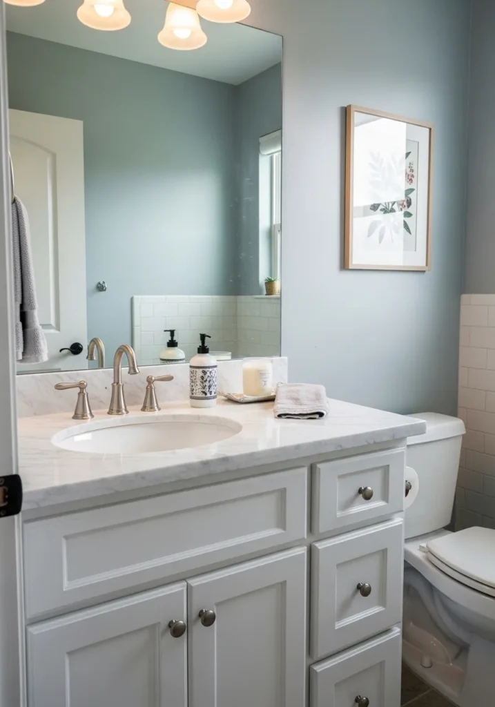To me, this bathroom is absolutely captivating because it feels like stepping into a high-end spa every single morning. The way the cool tones in the paint play off the warmth of the candle and the wood frame is just perfection. No matter how chaotic life gets outside that door, this little corner feels like a peaceful retreat where you can actually breathe. It is truly impressive how a simple color swap can turn a standard bathroom into such a chic and calming oasis.