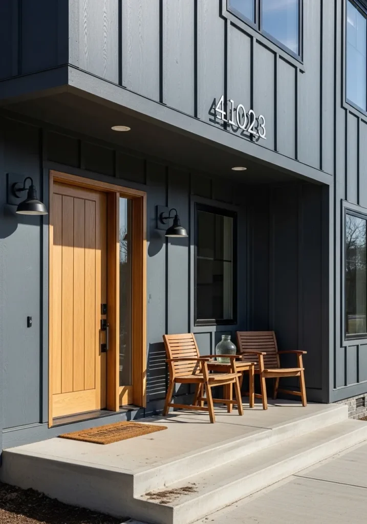 If you want to give your home a high-end designer feel, then this bold choice is exactly what you need. I am truly floored by how that warm wood tone practically glows against the dark siding. It creates such a luxurious and tailored first impression that feels both edgy and surprisingly welcoming. This look is perfect for anyone who wants to ditch the boring beige and embrace a home that feels like a true piece of modern art.