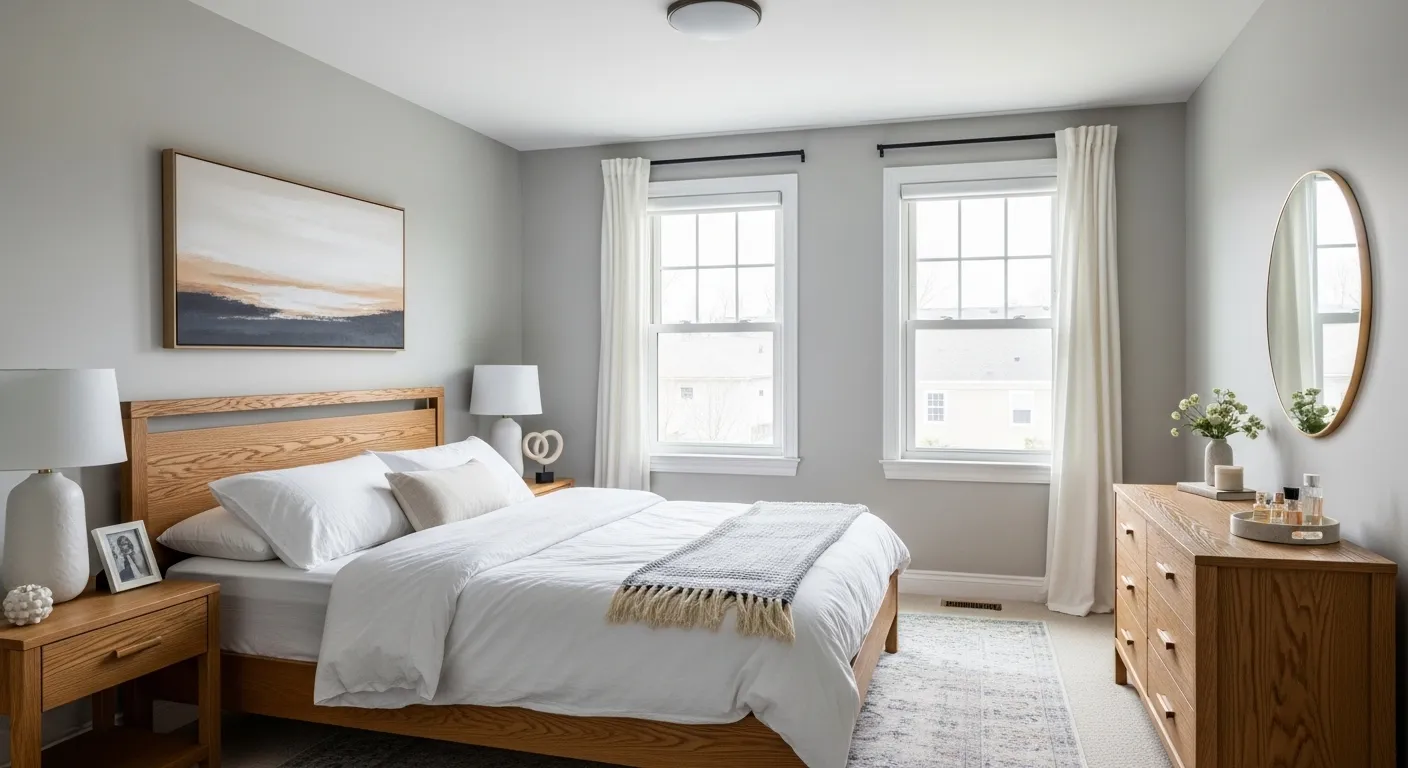 This guestroom is a masterclass in combining classic neutral tones with a touch of modern warmth. The walls are bathed in a beautiful, mid-tone gray that feels incredibly balanced, serving as a sophisticated backdrop for the stunning honey-oak bed frame and matching nightstands. Crisp white linens and a plush gray throw create a cloud-like sleeping area, while the oversized landscape art above the headboard pulls in those gorgeous earthy tones from the wood furniture. A soft, textured area rug and elegant white lamps finish the space, making the entire room feel like a high-end hotel suite.