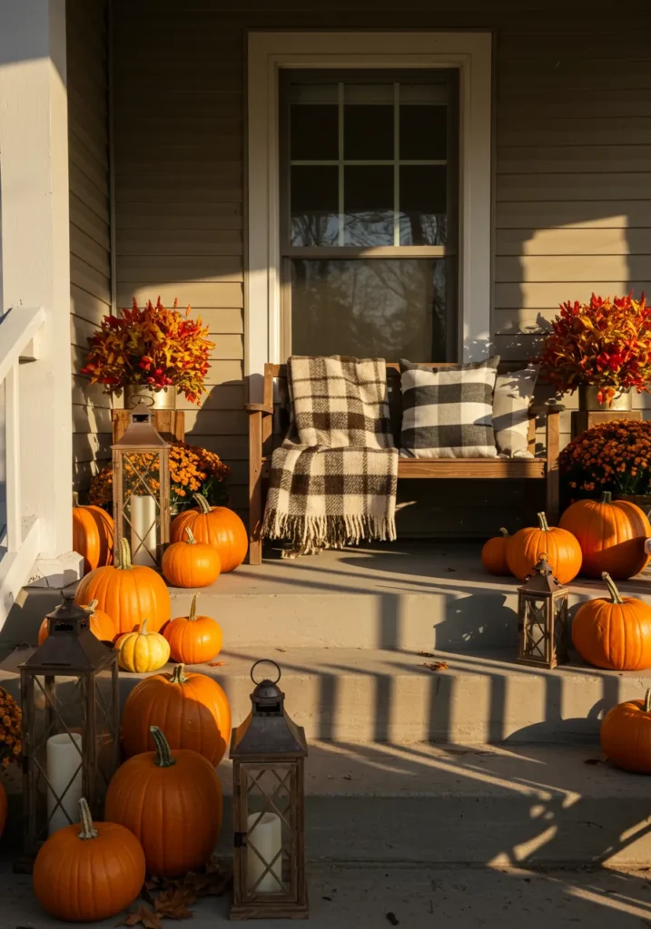 This front porch design feels like the perfect welcome for Thanksgiving. A simple wooden bench is dressed up with soft plaid throws and matching cushions that invite you to sit and linger. Bright orange pumpkins in different shapes and sizes are arranged along the steps, paired with rustic lanterns holding candles for a warm evening glow. Pots of autumn mums and vases filled with fiery fall leaves frame the space beautifully, making the entire porch look festive yet inviting.