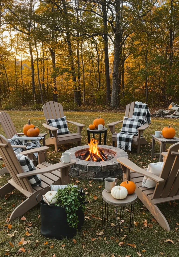 This setup feels like the definition of fall comfort. A circle of Adirondack chairs surrounds a glowing firepit, each one layered with checkered blankets, soft pillows, and mugs ready for warm cider or cocoa. Pumpkins in different shapes and sizes rest on side tables and chair arms, adding that effortless Thanksgiving charm. The golden forest in the background completes the scene, wrapping everything in that dreamy autumn light we all love.