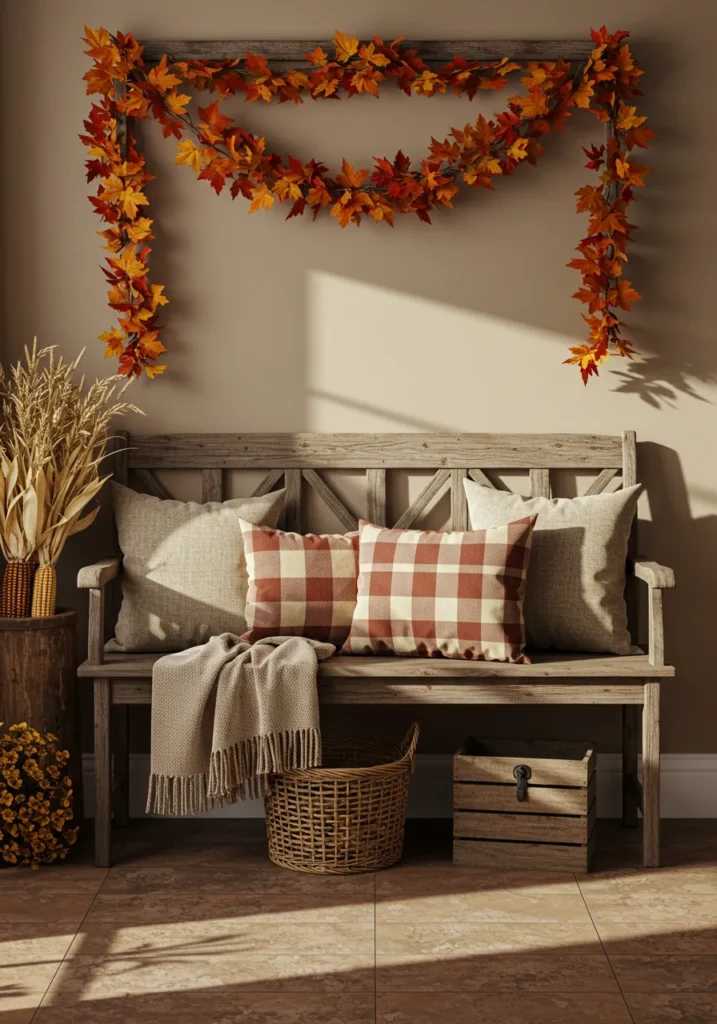 This cozy little corner feels like the perfect Thanksgiving welcome. A wooden bench sits against a soft beige wall, dressed up with plaid and linen pillows that instantly bring warmth. A chunky knit throw spills casually over the side, while a basket and wooden crate underneath add that effortless farmhouse feel. Above the bench, a garland of orange and red leaves frames the space beautifully, catching the sunlight in a way that makes the whole area glow.