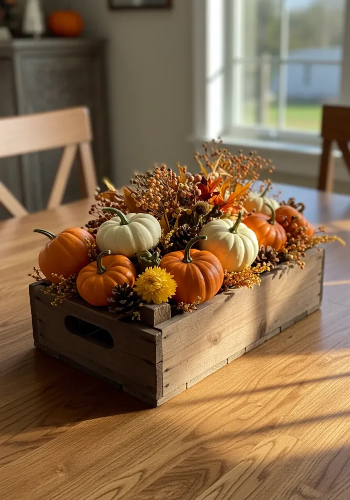This wooden crate centerpiece feels effortlessly seasonal and charming. Small orange and white pumpkins are nestled among dried berries, pinecones, and sprigs of golden foliage, creating a mix of textures that feels rich and cozy. The natural wood of the box pairs perfectly with the warm tones of the arrangement, making it a standout piece for any dining table or kitchen counter. The sunlight streaming through the window highlights every detail, giving it that soft, golden Thanksgiving glow.