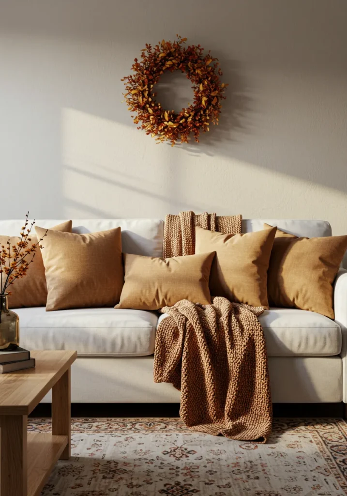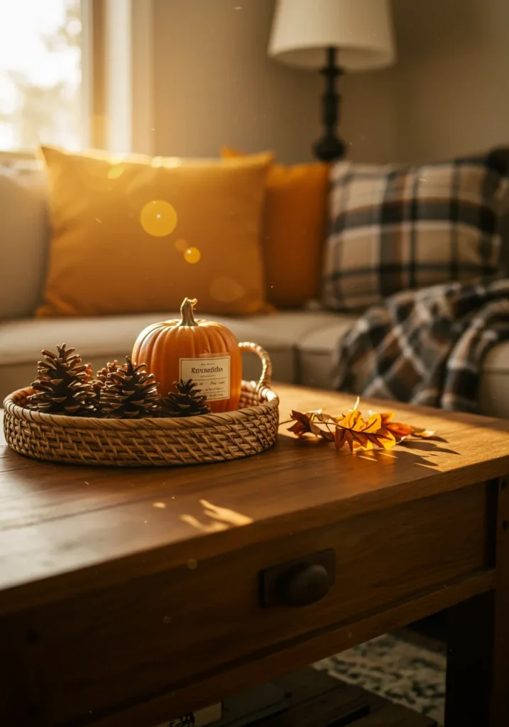 This living room setup is all about creating that soft and welcoming fall glow. A simple wooden coffee table holds a woven tray with a pumpkin-shaped candle and pinecones that add both texture and charm. Golden pillows brighten the sofa while a plaid throw draped casually on the side invites you to curl up with a cup of something warm. The sunlight streaming in makes the whole space feel golden and comforting, like the perfect cozy afternoon.
