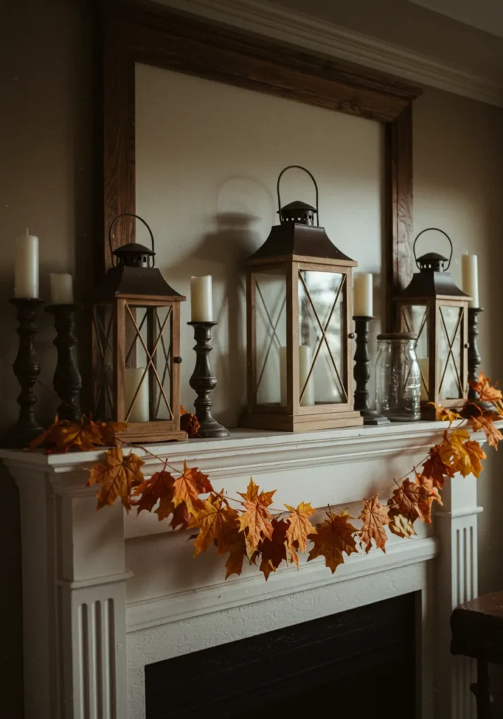 This mantel setup has that perfect mix of rustic charm and timeless elegance. Wooden lanterns and tall candle holders line the mantel, creating soft symmetry that feels warm and inviting. A garland of crisp orange leaves drapes gracefully across the front, adding that unmistakable fall touch. The natural wood tones of the mirror frame tie everything together beautifully, giving the whole space a cozy, candlelit glow even before the candles are lit.