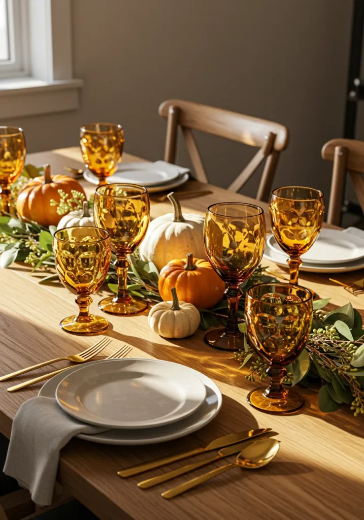 I love how this design feels effortless yet refined. The amber tones from the glasses and the greenery make everything come alive when the light hits. It feels like the kind of table you’d want to sit at for hours, sharing stories and seconds. There’s something so timeless and welcoming about the mix of natural textures and warm colors—it just screams cozy Thanksgiving perfection.