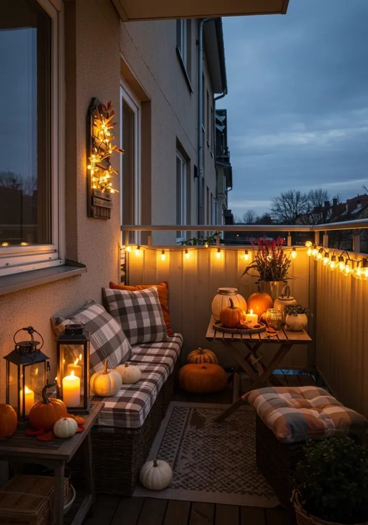 I’m completely obsessed with how inviting this looks. It proves that you don’t need a big backyard to enjoy the season—just a few thoughtful touches and some warm light. The glow from the candles and string lights feels magical, and I can easily imagine curling up here with a blanket and a cup of tea, watching the city quiet down after dinner. It’s small-space styling done perfectly.