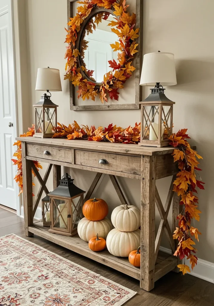 This entryway is full of that welcoming, homey Thanksgiving charm. A rustic wooden console table holds lanterns, lamps, and a beautiful garland of golden leaves that trails softly over the edges. The matching wreath above the mirror ties everything together, creating a warm symmetry that catches your eye the moment you walk in. A few pumpkins in soft white and deep orange tones sit neatly on the bottom shelf, adding just the right touch of seasonal color.
