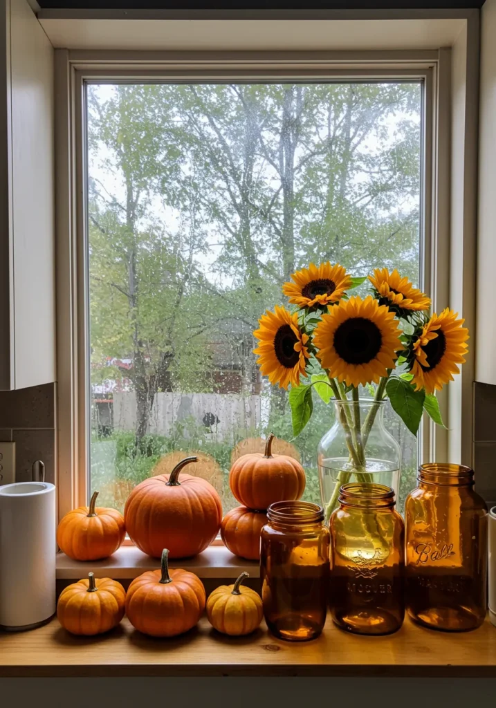 This kitchen window scene feels like pure autumn sunshine. A row of mini pumpkins in rich orange shades sits perfectly along the sill, paired with amber glass jars that catch the light beautifully. A tall vase of cheerful sunflowers adds the final touch, bringing color and warmth even on a rainy afternoon. The simple wooden ledge and natural textures make everything feel cozy, like a snapshot of fall’s best moments.