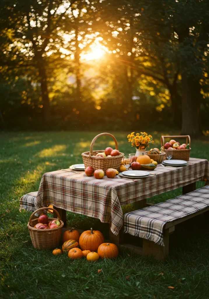 This outdoor table setup feels straight out of a cozy autumn postcard. A plaid tablecloth sets the tone, covered with baskets of shiny apples, cheerful yellow flowers, and a few pumpkins tucked underneath for good measure. The soft glow of the setting sun filters through the trees, giving everything that golden-hour magic. It’s simple, earthy, and full of the kind of charm that makes outdoor meals feel extra special.