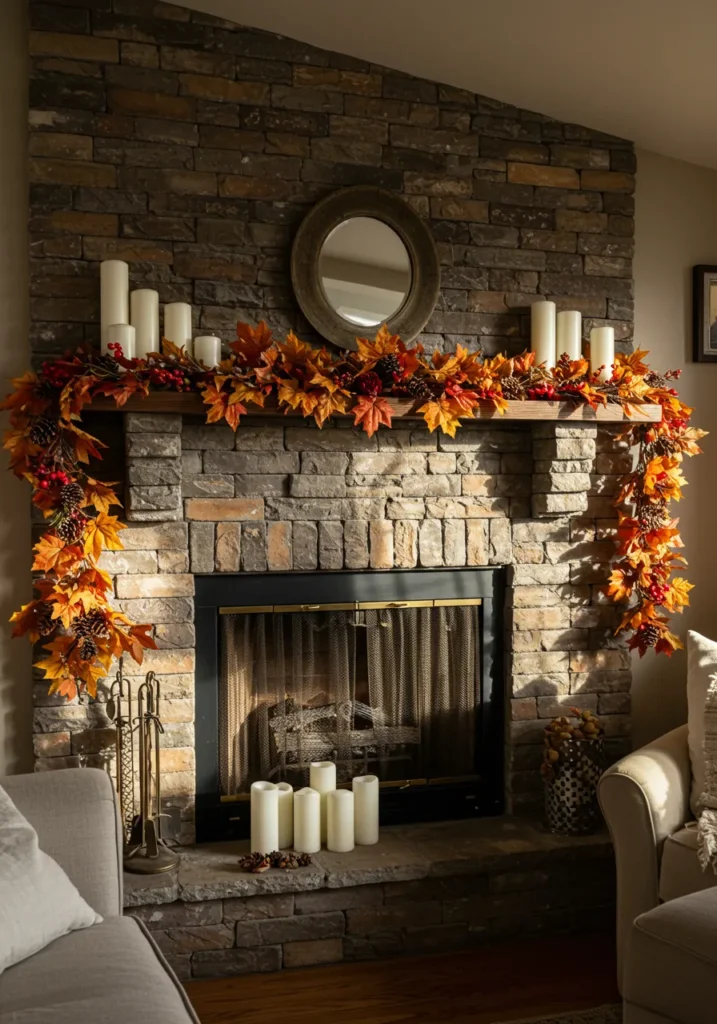 This stone fireplace instantly feels like the heart of the home with its rustic charm and seasonal accents. A lush garland of golden leaves, pinecones, and berries drapes across the mantel, adding rich texture and warmth. Simple white candles in varying sizes are placed on top and at the hearth, creating that cozy glow everyone loves on crisp fall evenings. A round mirror centered above ties everything together and makes the entire space feel inviting and balanced.