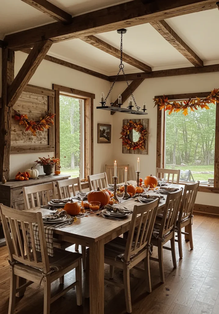 This dining room has that perfect cozy, cabin-style warmth that makes Thanksgiving feel extra special. The natural wood table and chairs pair beautifully with the exposed beams and soft beige walls. Mini pumpkins line the center of the table among flickering candles, creating a relaxed but elegant centerpiece. The windows are framed with leaf garlands that catch the afternoon light, while a matching wreath on the wall ties the whole space together.