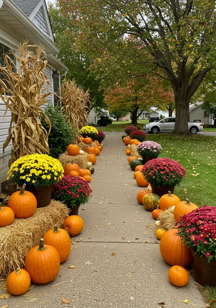 This cheerful walkway feels like a warm welcome straight into Thanksgiving season. Bright mums in shades of yellow, red, and pink line the path, paired perfectly with clusters of pumpkins and hay bales. Tall cornstalks frame the entrance, adding that classic harvest touch. The mix of textures and fall colors makes the whole setup look lively and inviting, creating the perfect entrance for family gatherings or friendly visits.