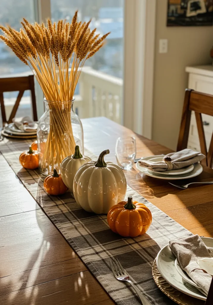 This dining table is styled with such simple elegance that it feels effortlessly festive. A plaid table runner sets the stage while ceramic pumpkins in white and orange create a balanced centerpiece. The clear glass vase filled with golden wheat stalks adds height and texture, instantly giving that harvest season feel. Neutral plates with folded linen napkins are neatly set at each place, making the whole table look polished yet warm.