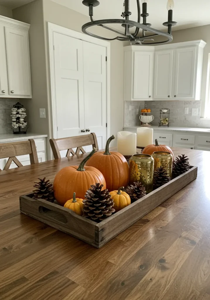 This kitchen setup shows how effortless fall decorating can be with just a few natural elements. A sturdy wooden tray sits at the center of the dining table, filled with bright orange pumpkins, pinecones, and gold-toned candle holders that sparkle softly in the light. Paired with neutral cabinetry and a clean, airy backdrop, the whole arrangement feels warm and inviting without being over the top. It’s that perfect balance of rustic textures and cozy elegance that instantly makes the room feel ready for Thanksgiving gatherings.