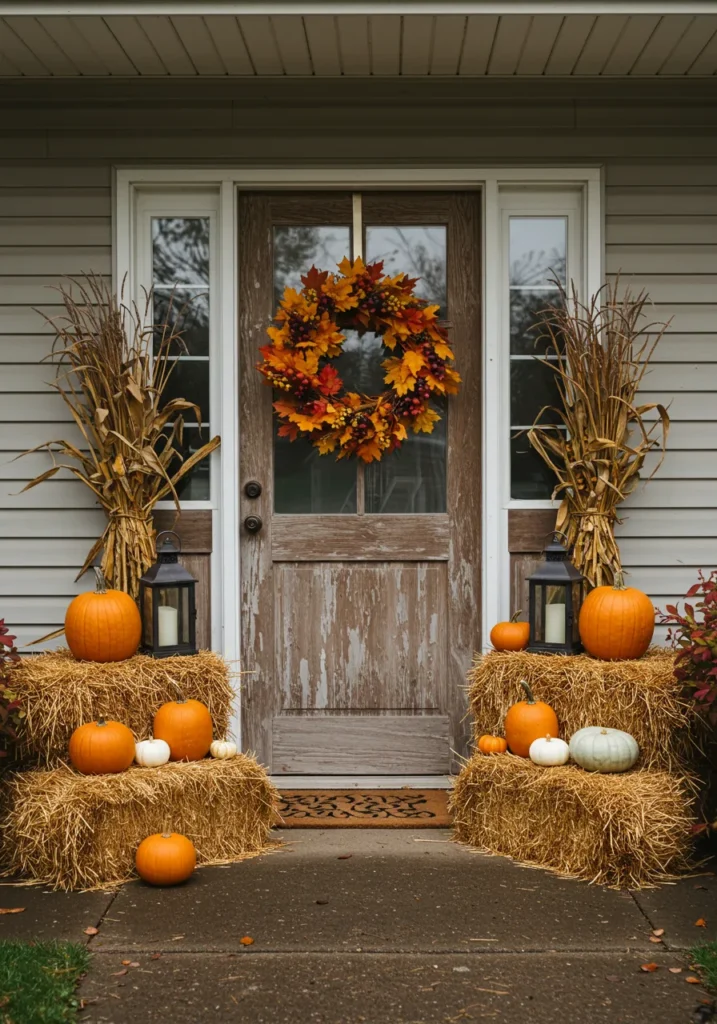 This front porch creates such a warm seasonal statement with its classic farmhouse-inspired setup. Bundles of dried corn stalks frame the rustic wooden door, while hay bales stacked on each side hold an assortment of pumpkins in different shapes and colors. Two black lanterns with candles add a soft glow that makes the space feel extra inviting as the sun sets. To complete the look, a vibrant autumn wreath filled with rich orange and red leaves hangs front and center, tying everything together in the most charming way.
