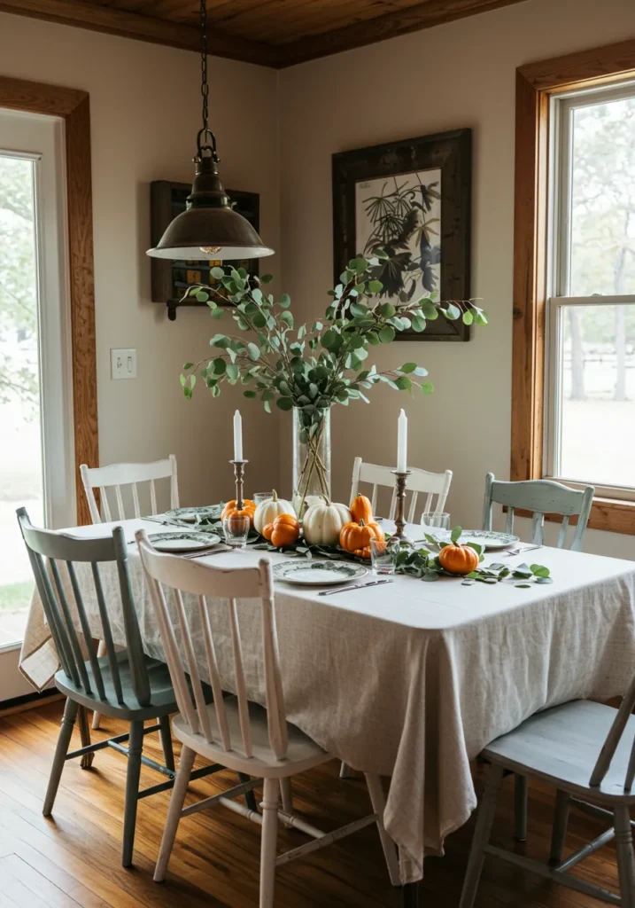 This dining nook has such a simple yet heartwarming style that makes it perfect for Thanksgiving gatherings. A soft linen tablecloth sets the stage, while mismatched farmhouse chairs in muted colors add so much charm around the table. The centerpiece is all about balance, with mini pumpkins in orange and white scattered along a garland of fresh greenery, complemented by tall candlesticks for a touch of elegance. A tall vase filled with branches adds height and brings a little outdoor freshness inside, making the whole space feel alive.