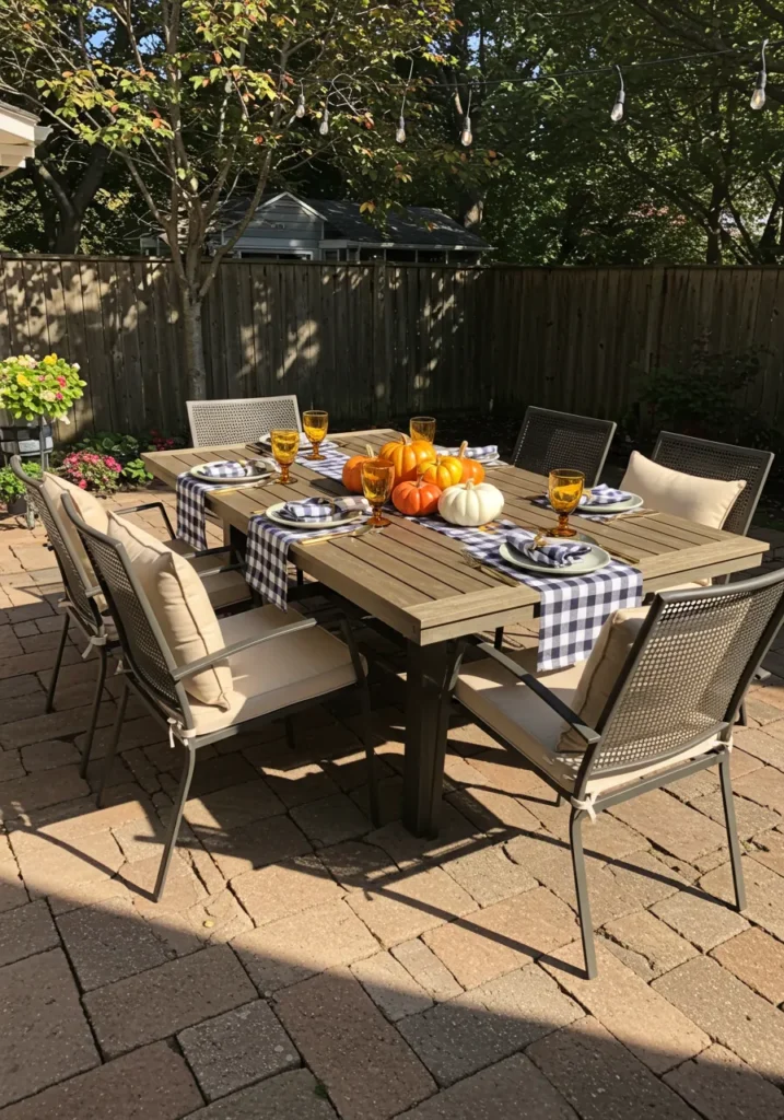 I adore how this space makes outdoor dining feel just as cozy as being inside. There’s something so special about enjoying a Thanksgiving meal with the fresh fall breeze and leaves rustling nearby. The mix of casual checks with the bright pumpkins feels both relaxed and celebratory, which is exactly the kind of balance I want when hosting. It’s stylish without trying too hard, and honestly, I can picture myself lingering here with friends well past dessert.